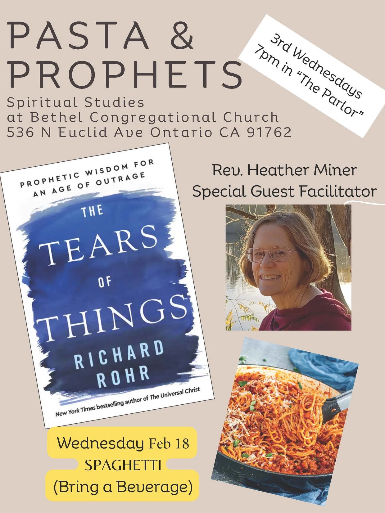 Join us as we enjoy the fellowship of a pasta themed meal (February is Spaghetti...) and explore Richard Rohr's "The Tears of Things" (Prophetic Wisdom fo an Age of Outrage)